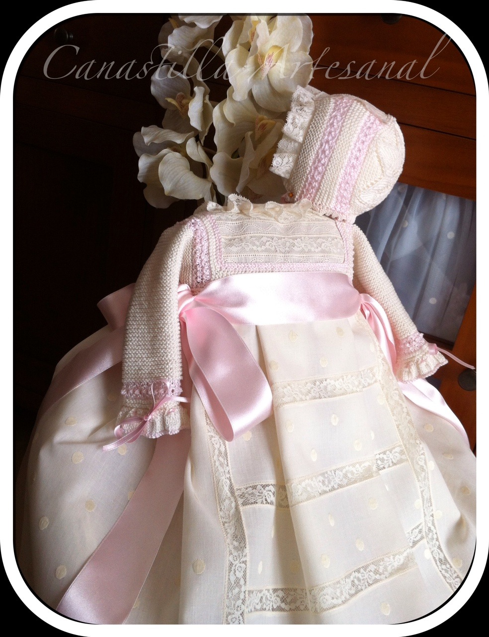 Falda confeccionada en fina batista suiza salpicada de bodoques bordados, entredoses de valenciennes y dos lazotes de raso en ambos lados.